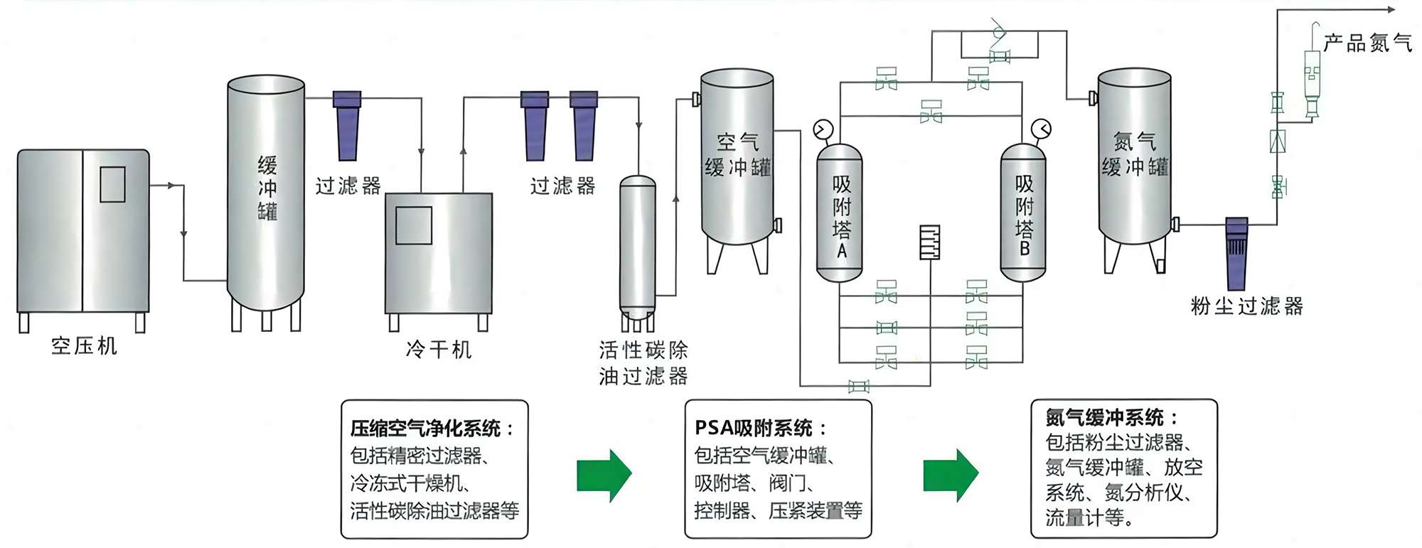 變壓吸附法通常使用兩塔并聯(lián),交替進行加壓吸附和解壓再生,從而獲得連續(xù)的氮氣流。